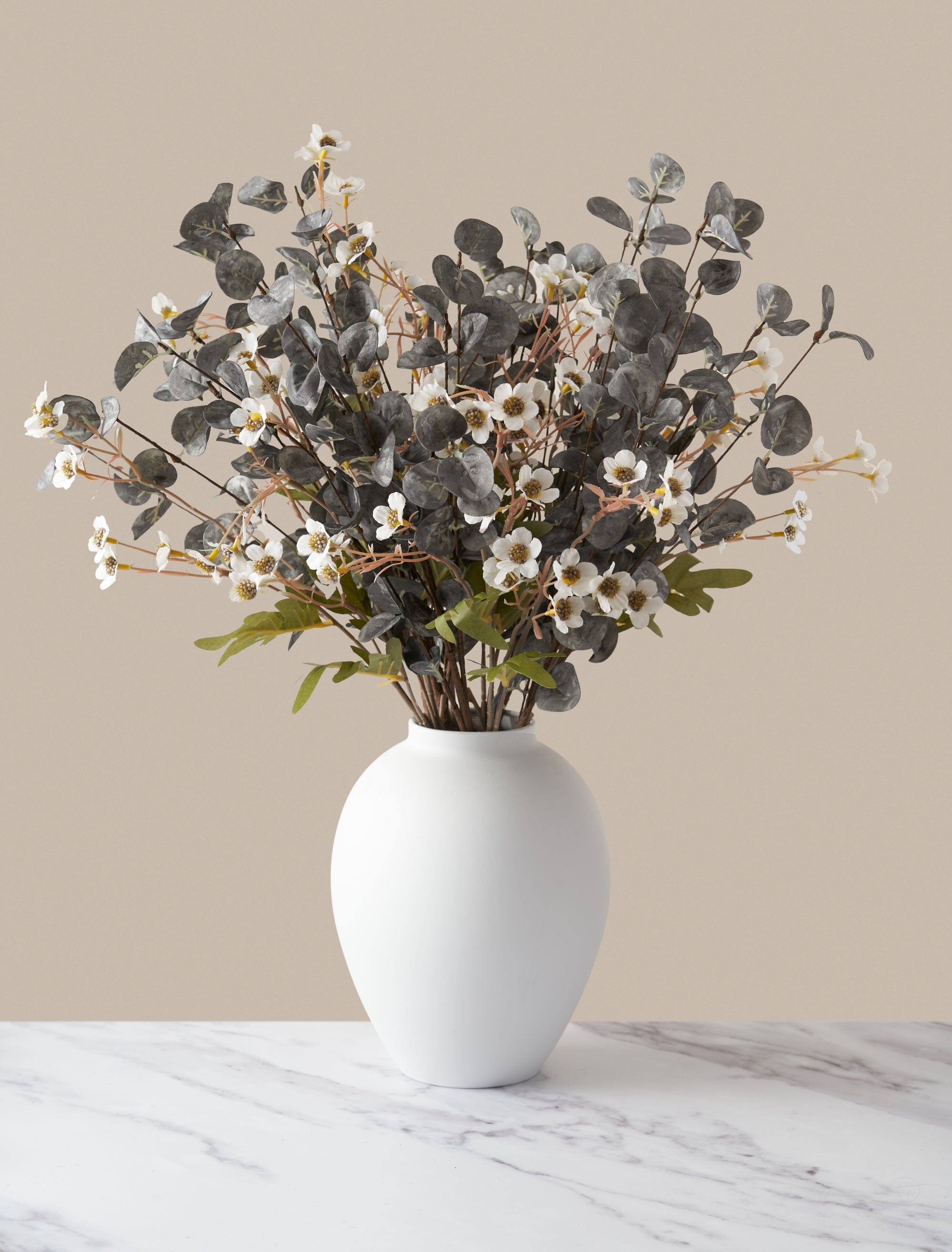 Dieses Kunstwachs-Arrangement kombiniert unseren anmutigen grünen Kunst-Eukalyptus - 5 Stiele und unsere weiße Kunstwachsblume - 10 Stiele.