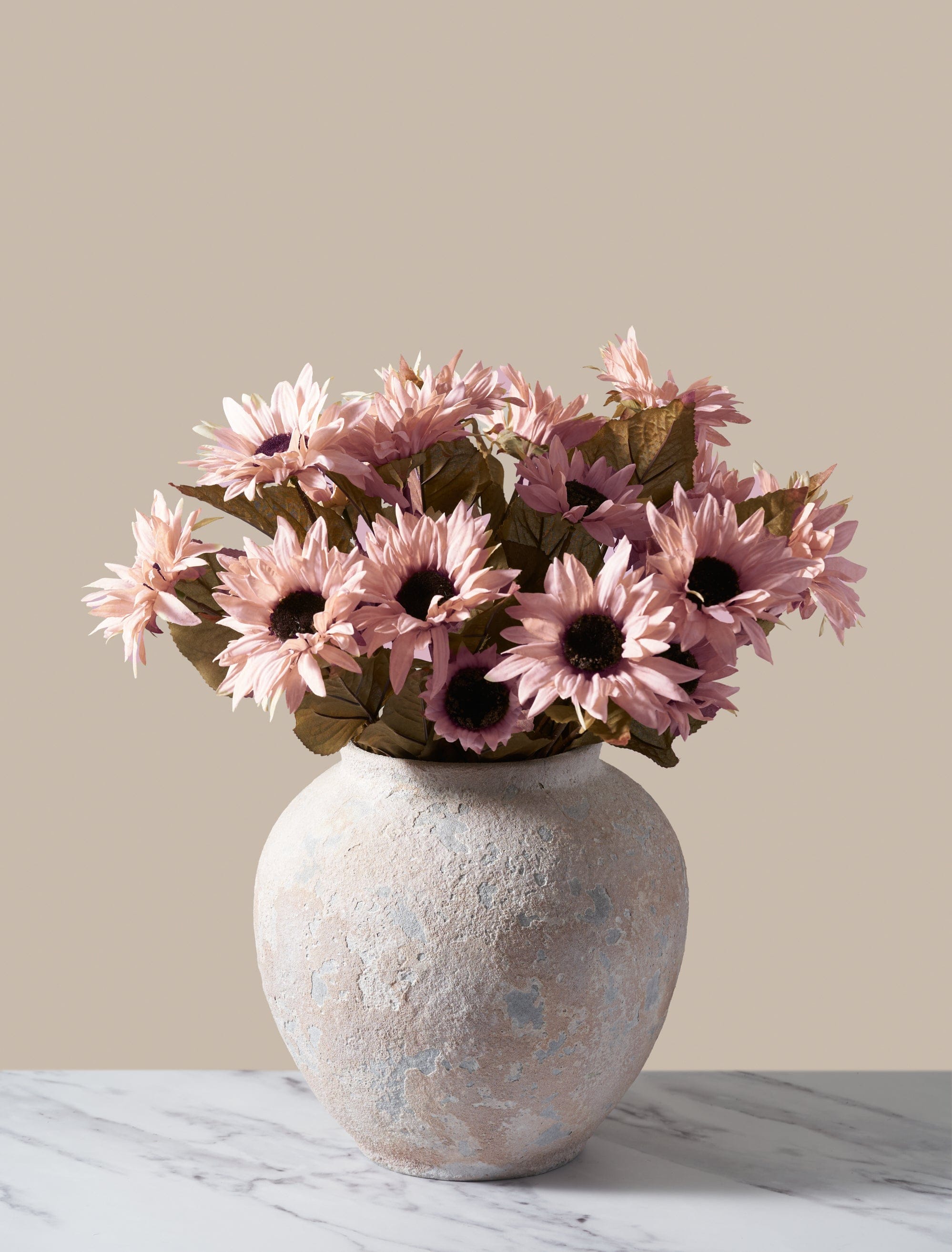 Unsere künstlichen Sonnenblumen eignen sich perfekt für die Herbstsaison und verleihen Ihrem Zuhause eine fröhliche, heitere Note. Mit ihren zarten Blütenblättern und der gedämpften rosa Farbe ahmen diese Kunstblumen echte Trockenblumen nach und sorgen so für einen natürlichen und authentischen Look.