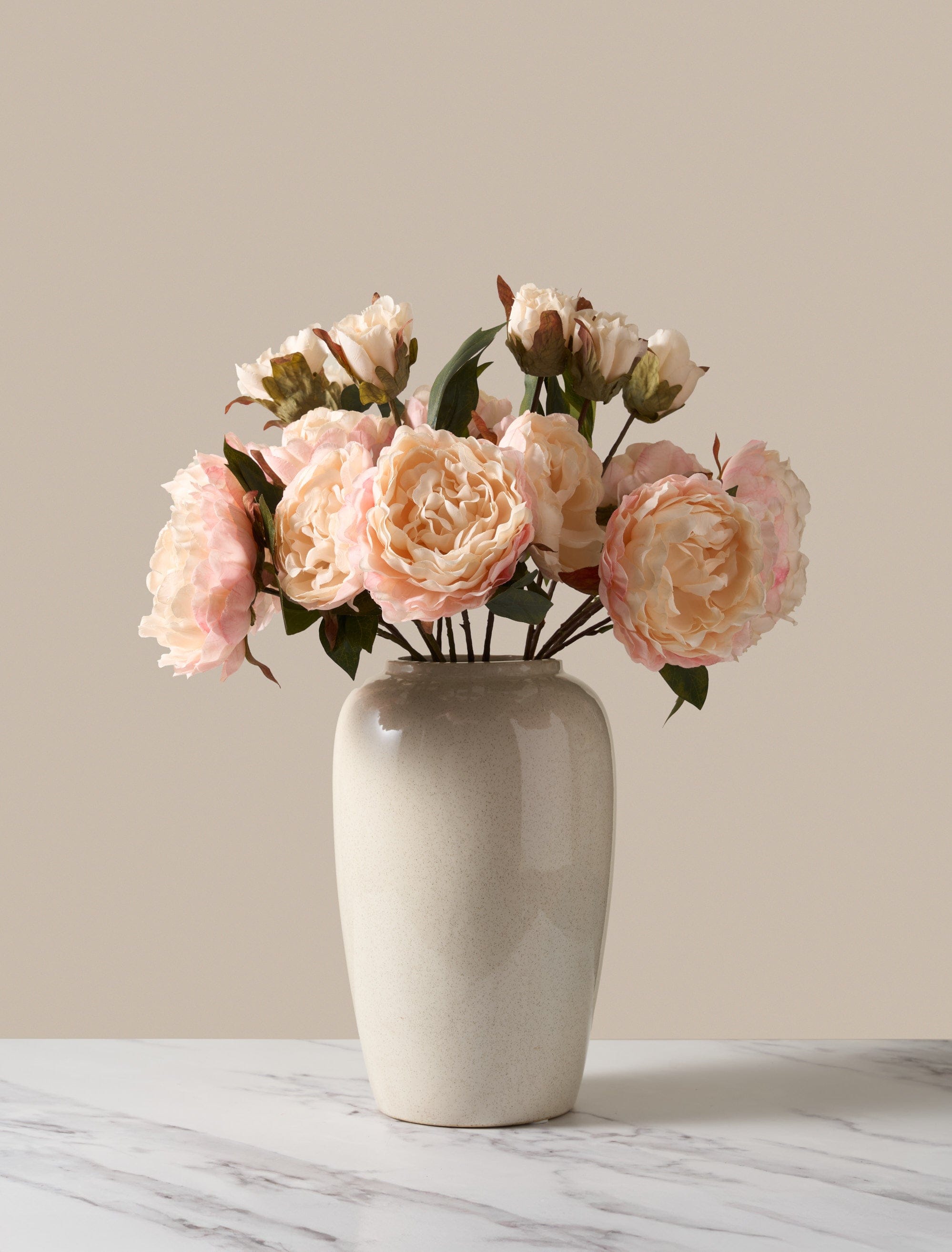 Delicate blush peonies with gently layered petals create a timeless and feminine look. Ideal for brightening a room with a soft, airy feel, these stems offer long-lasting beauty without the upkeep.
