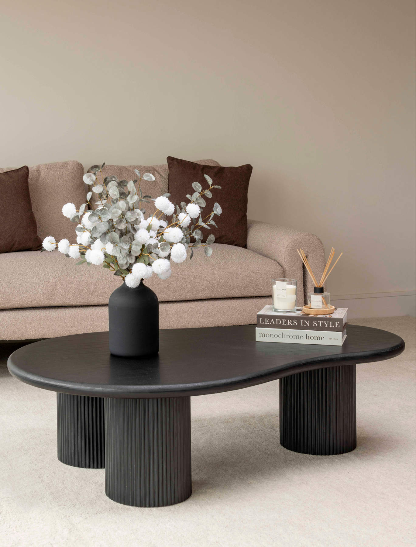 A beautifully irregular coffee table with softly curved edges and ribbed legs, finished in a deep black wood effect. The Luna coffee table brings quiet character and contrast to a room — ideal if you love furniture that feels contemporary yet grounded.