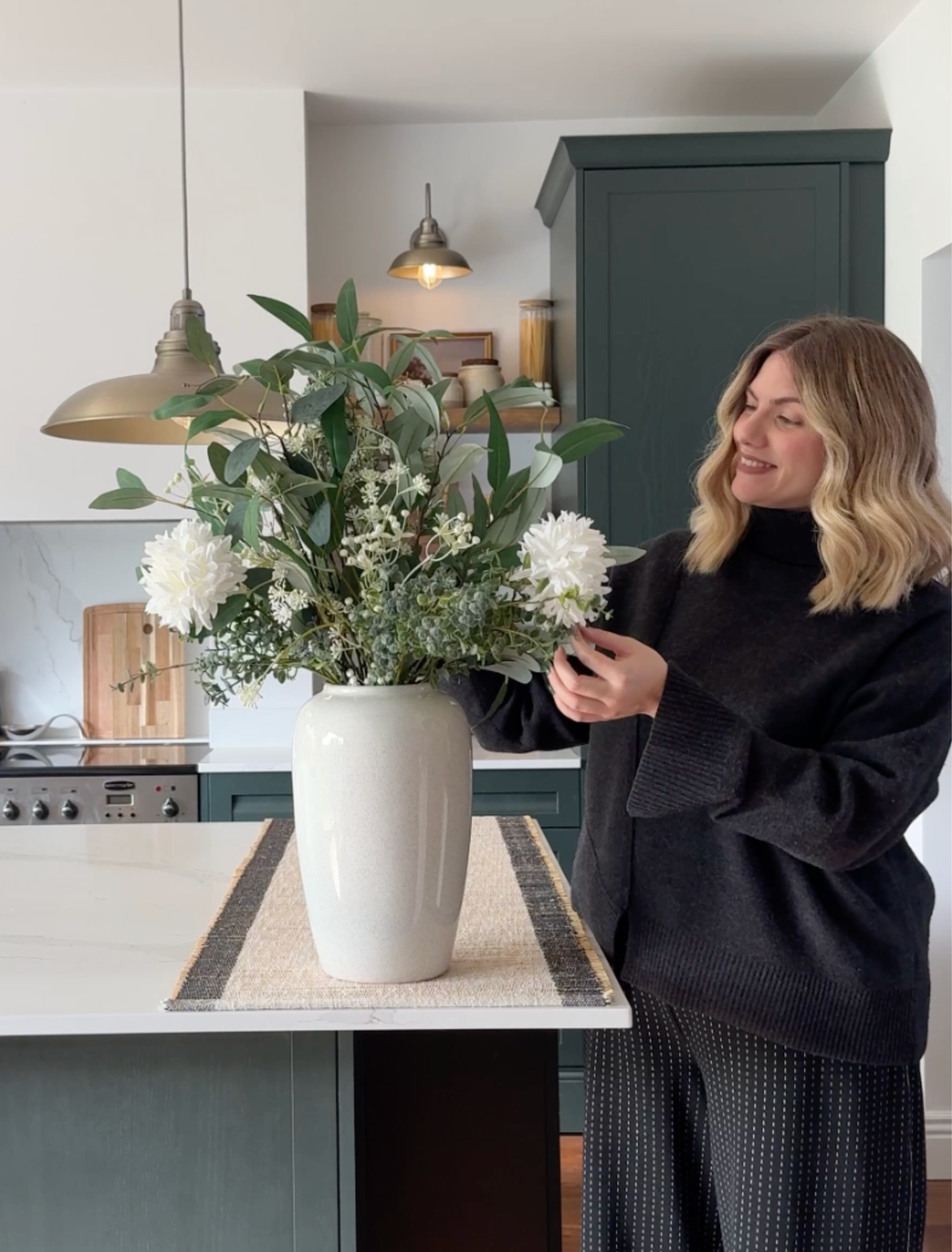 Elegante witte dahlia's nestelen zich tussen frisgroen blad in dit frisse kunstbloemenarrangement. Als u dat verfrissende gevoel in huis wilt halen, dan is dit het arrangement voor u. Fris, tijdloos en moeiteloos elegant.