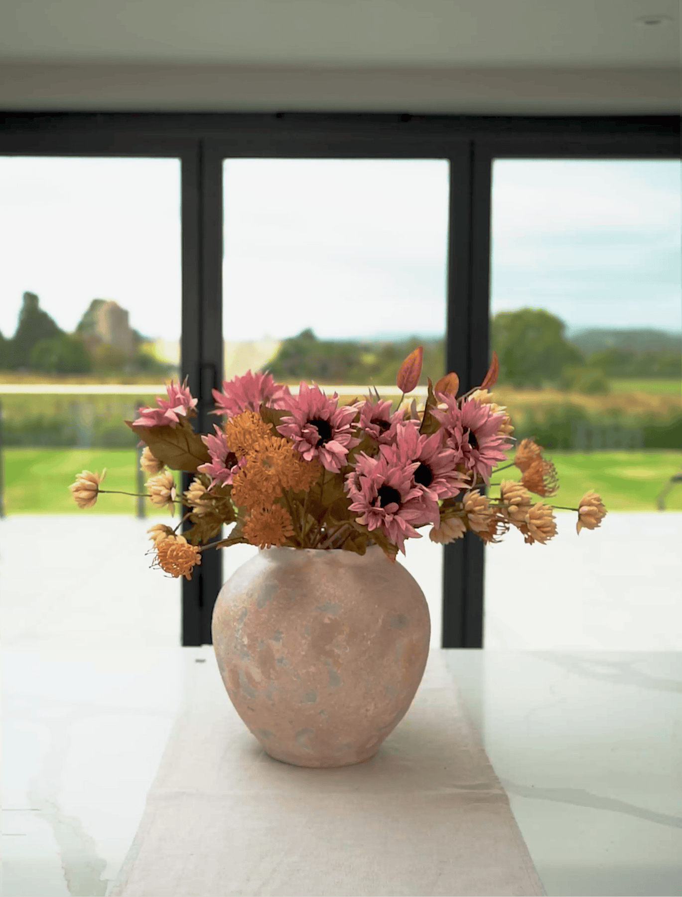 Een prachtig herfstarrangement met een mix van felgekleurde bloemen voor een prachtig kleurenspel.