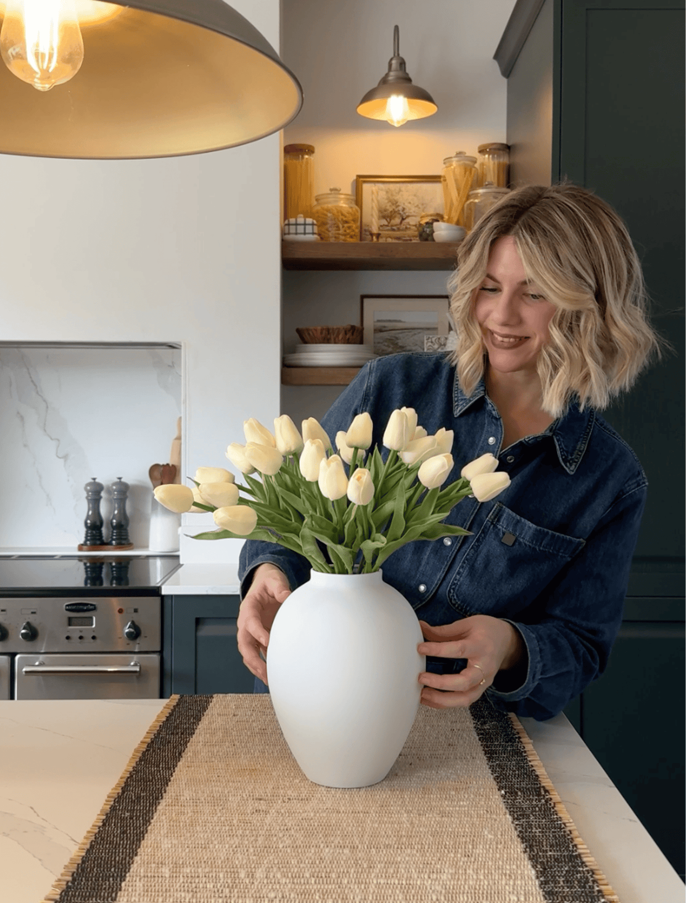 Deze prachtige imitatietulpen zien er net echt uit, met realistische bloemblaadjes en buigbare stelen waarmee je precies de vorm kunt creëren die je wilt. Ze worden verkocht in een bos van 25 stelen voor een complete look en passen perfect bij onze Ella vaas zoals afgebeeld.