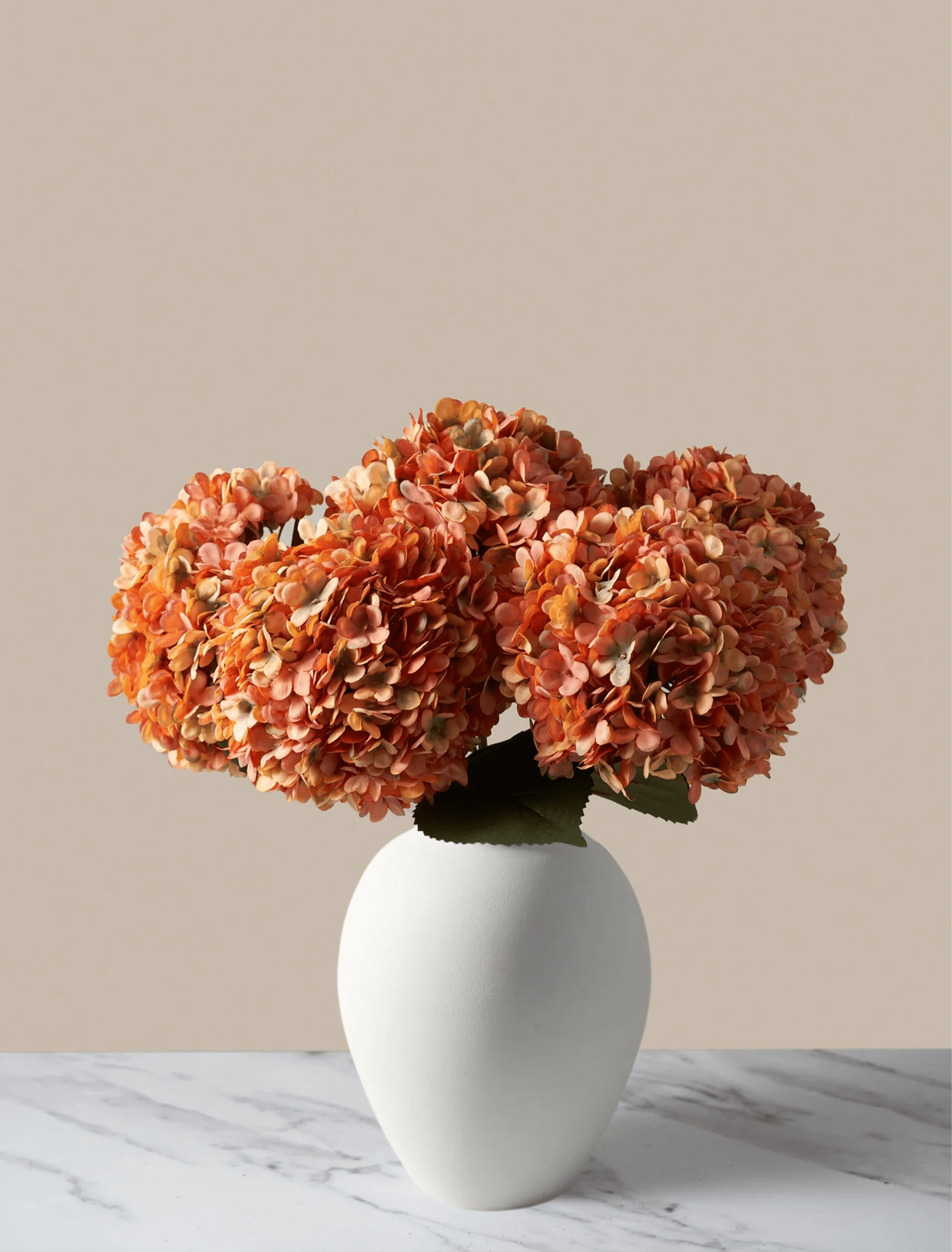 Prachtige grote hortensia's die lijken op de klassieke 'Hydrangea Annabelle'. Deze delicate nepbloeiers zijn ideaal voor de lente en de zomer. Onze Sunrise kleur is het perfecte felle oranje om een vleugje vrolijkheid toe te voegen en elke kamer op te fleuren.